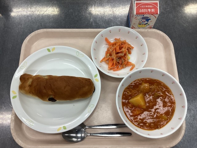 今日の給食は、ぶどうパン、牛乳、トマトシチュー、にんじんサラダです。