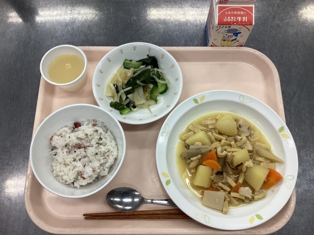 今日の給食は、梅わかごはん、牛乳、五目うま煮、じゃこサラダ、りんごゼリーです。