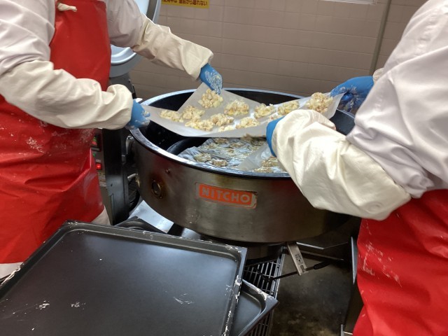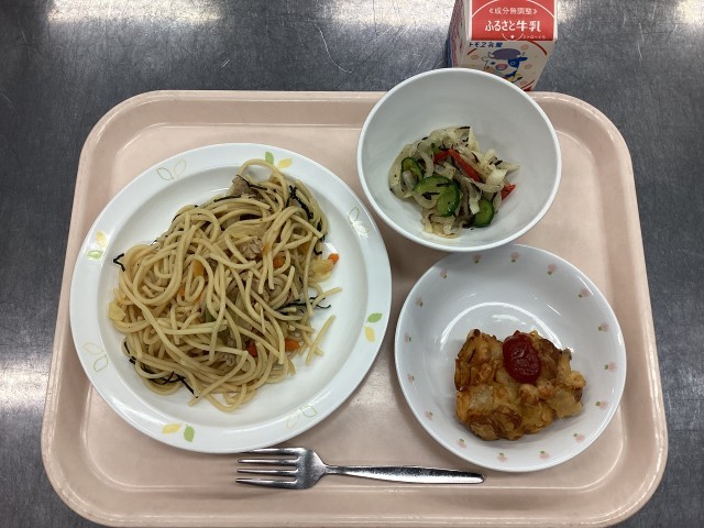 今日の給食は、和風スパゲティ、牛乳、大根とひじきのサラダ、大豆とコーンのフリッターです。