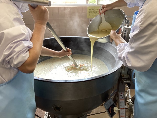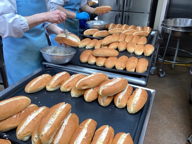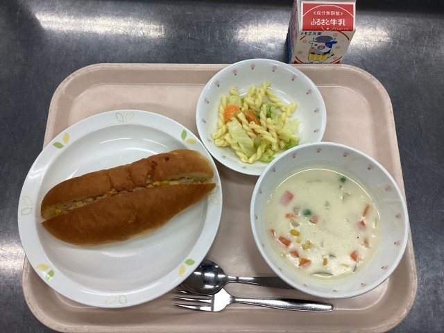 今日の給食は、ツナコーントースト、牛乳、クリームスープ、マカロニとキャベツのサラダです。