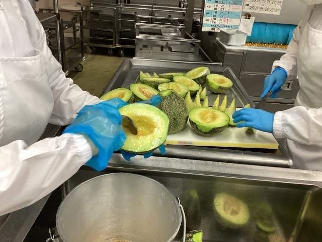 今日の給食は、ドリア風ごはん、マセドアンサラダ、くだもの(メロン)です。