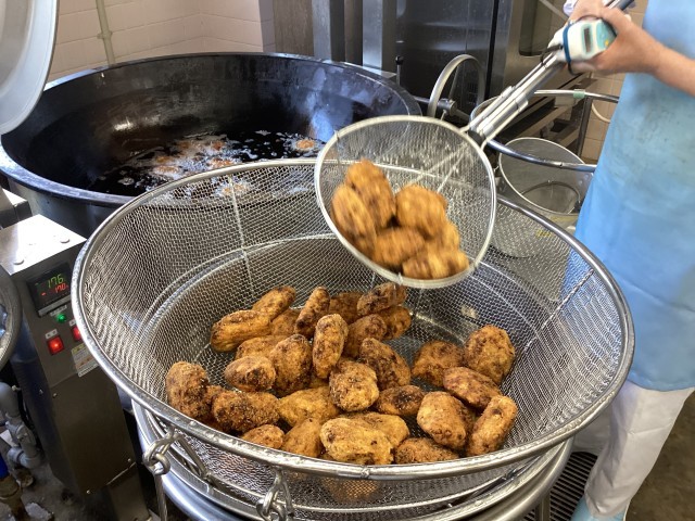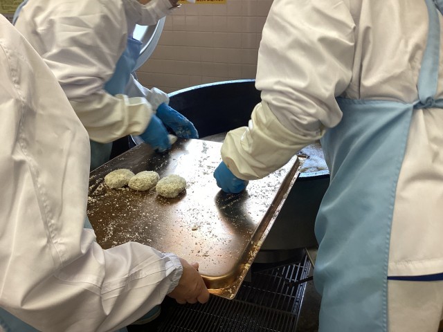 今日のコロッケは、なめらかで食べやすく仕上がりました。タネが柔らかく、爆発しないようにそっと釜へ入れ、優しく丁寧に揚げました。外はとても暑いですが、冷房を使用している給食室も火を使うと一気に室温が上がります。熱中症対策をしっかりしながら、調理員さんも頑張って調理しています。