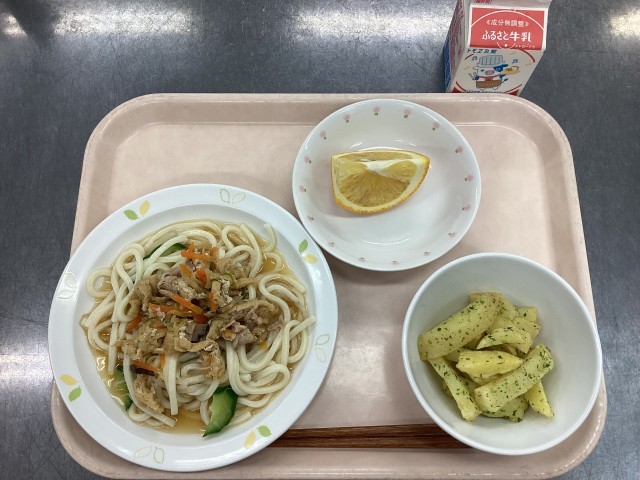 今日の給食は、五目冷やしうどん、牛乳、青のりフライドポテト、くだもの(甘夏)です。