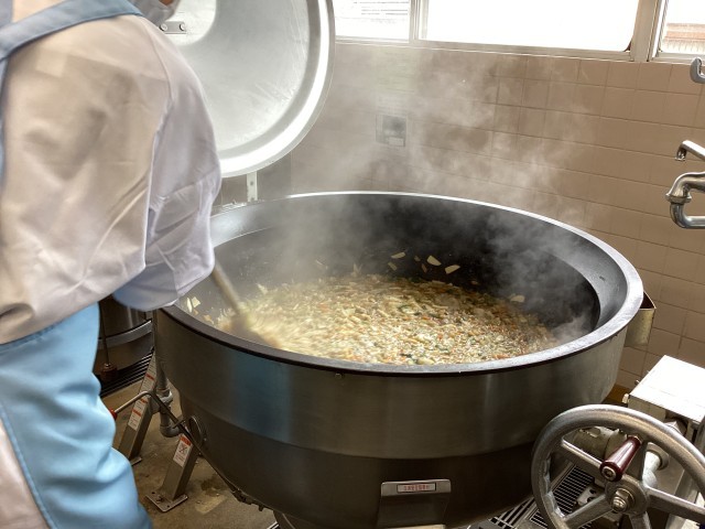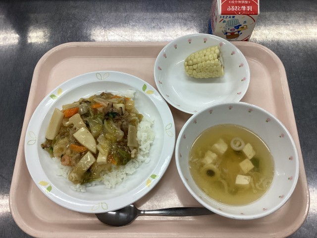 今日の給食は、中華丼、牛乳、豆腐のスープ、とうもろこしです。