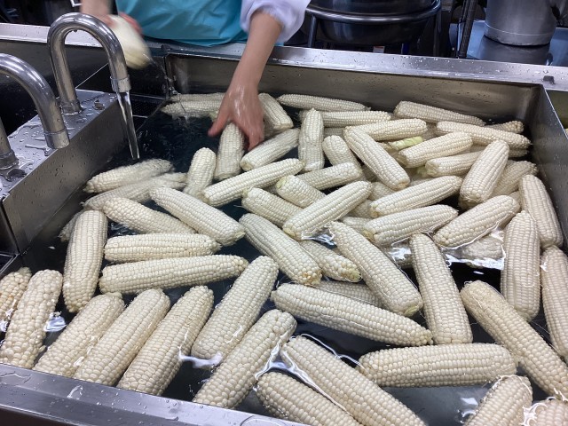 今日は、ホワイトショコラという品種で粒が白いホワイトコーンのとうもろこしにしました。粒が真っ白で果皮が柔らかく、甘みが強いのが特徴です。2年生がとうもろこしの皮をむいてくれました。美味しくいただきましょう。