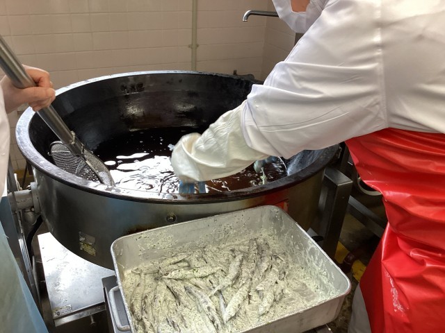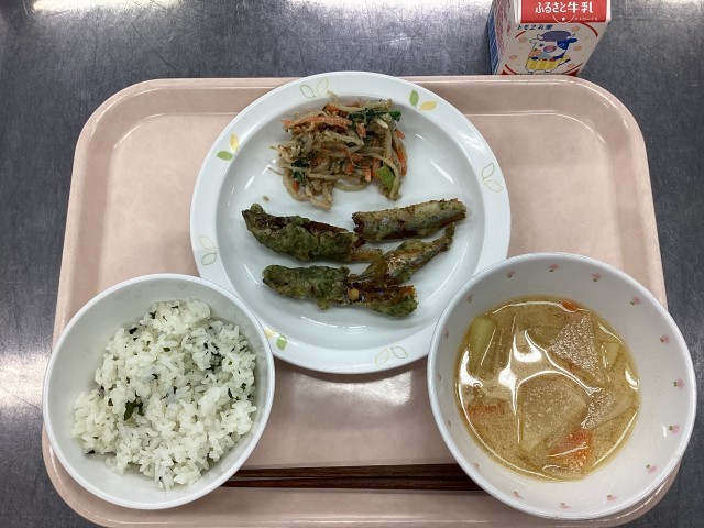 今日の給食は、わかめごはん、牛乳、ししゃもの磯辺揚げ、ちくわと野菜のごまあえ、豆乳入りみそ汁です。