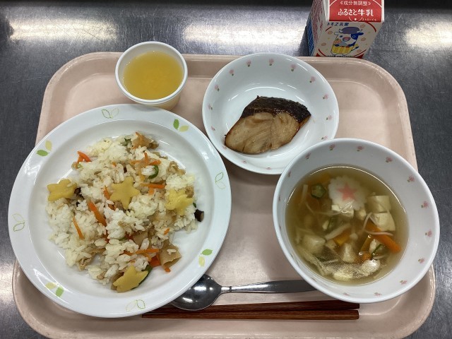 今日の給食は、五目ずし、牛乳、魚の照り焼き、七夕汁、フルーツゼリーです。