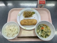 今日の給食は、五目ごはん、牛乳、切干大根の卵焼き、もやしのコチュジャンがけ、くだ...
