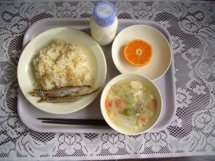 今日のメニューは、雑穀ご飯、豚汁、焼きししゃも、果物、牛乳です。