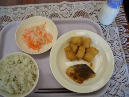 今日のメニューは、わかめご飯、魚の南蛮焼き、じゃがいもの甘辛煮、大根の甘酢かけ、...