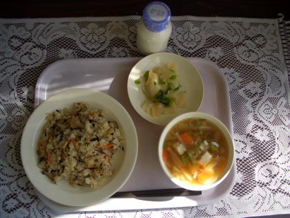 今日のメニューは、ひじきご飯、けんちん汁、かぶのレモンしょうゆかけ、牛乳です。