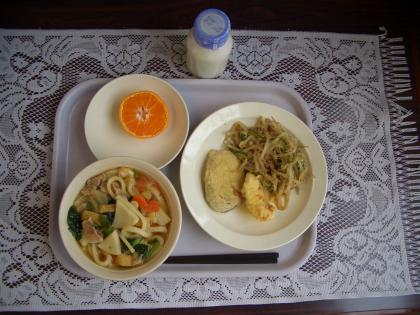 今日のメニューは、煮込みうどん、天ぷら、ごま酢かけ、くだもの、牛乳です。
