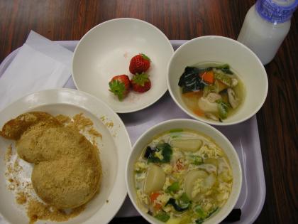 今日のメニューは、あげぱん、卵雑煮、くだもの(イチゴ)、牛乳です。 卵アレルギー...