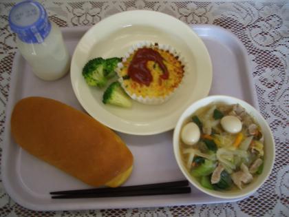 本日の献立は、パンプキンパン、チーズ入り卵焼き、白菜と春雨のスープ、ゆでブロッコ...