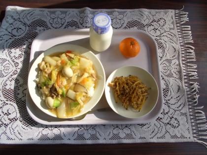 今日の献立は、中華丼、かえりきんぴら、みかん、牛乳です。