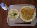 今日の献立は、ご飯、ふりかけ、牛乳、ジャンボ餃子、中華サラダです。