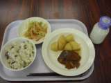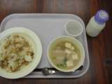 今日の献立は、こぎつねご飯、牛乳、三平汁、小豆ゼリーです。 下の画面は、...