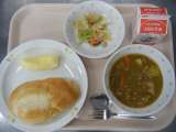 今日の給食は、ソフトフランスパン、牛乳、ツナサラダ、カレーシチュー、くだもの(り...