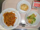 今日の給食は、スパゲティナポリタン、牛乳、野菜のイタリアンドレッシング、りんごマ...