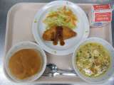 今日の給食は、丸パン、牛乳、白身魚のフライ、添え野菜、トマトと卵のスープです。 ...