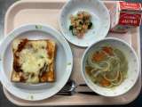 今日の給食は、ピザトースト、牛乳、ヌードルスープ、ビーンズサラダです。