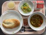 今日の給食は、ソフトフランスパン いちごジャム添え、牛乳、カレーシチュー、フレン...