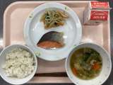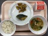 今日の給食は、麦ごはん、牛乳、魚の塩焼き、カリカリ油揚げと野菜のひたし、すいとん...