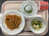 今日の給食は、スパゲティナポリタン、牛乳、野菜のイタリアンドレッシングがけ、米粉...
