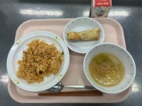 今日の給食は、キムチチャーハン、牛乳、パリパリひじき、白菜の中華スープです。パリ...