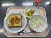 今日の給食は、りんごバタートースト、牛乳、クリームシチュー、野菜のレモンサラダで...