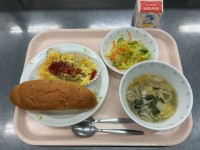 今日の給食は、ぶどうパン、牛乳、スペイン風オムレツ、にんじんドレッシングサラダ、...