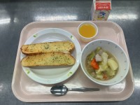 今日の給食は、ガーリックトースト、牛乳、ポトフ、オレンジゼリーです。今日は世界の...