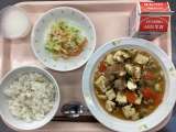 今日の給食は、麦ごはん、牛乳、家常豆腐、中華サラダ、ホワイトゼリーです。