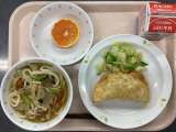 今日の給食は、けんちんうどん、牛乳、ツナとポテトのパリッと揚げ、キャベツときゅう...