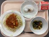 今日の給食は、スパゲティ地中海ソース、牛乳、大根とひじきのサラダ、おからのスノー...