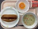 今日の給食は、ホットドッグ、牛乳、コーンチャウダー、くだもの(菊花みかん)です。...