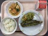今日の給食は、ごはん、牛乳、ししゃもの磯辺揚げ、ごま酢かけ、生揚げのそぼろあんか...
