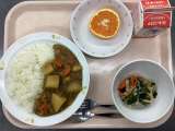 今日の給食は、シーフードカレーライス、牛乳、わかめサラダ、くだもの(はれひめ)で...