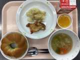 今日の給食は、あしたばパン、りんごジュース、ローストチキン、ジャーマンポテト、キ...