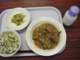 今日の献立は、青菜とじゃこのご飯、牛乳、生揚げのそぼろあんかけ、野菜のごますかけ...