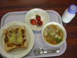今日の献立は、ピザトースト、牛乳、白いんげん豆の田舎風スープ、くだものです。
