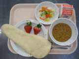 今日の給食は、ナン、牛乳、ポテト入りフレンチサラダ、キーマカレー、くだもの(いち...