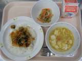 今日の給食は、キムチ丼、牛乳、こんにゃくサラダ、中華風コーンスープです。 ≪食...
