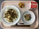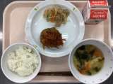 今日の給食は、ごはん、牛乳、豆腐入りハンバーグ、こんにゃくサラダ、みそ汁です。 ...