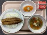 今日の給食は、さんまのかば焼き丼、牛乳、けんちん汁、くだもの(天草オレンジ)です...