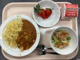 今日の給食は、チリビーンズライス、牛乳、キャベツとツナのサラダ、くだもの(いちご...