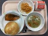 今日の給食は、パインパン、牛乳、魚のバーベキューソース、スパゲティソテー、野菜ス...