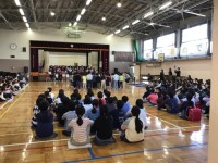 6年生と3年生の歌のハーモニーです。3年生が歌い出すと6年生達が立ち出し一緒に歌...