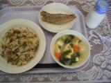 今日のメニューは、チャーハン、牛乳、わかめスープ、くだものです。今日も調理員さ...