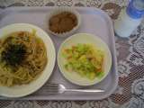 今日のメニューは、和風スパゲッティー、牛乳、キャベツサラダ、おからマフィンです...